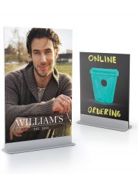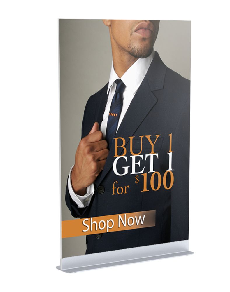 These graphic mounts accept 3/16" thick graphic media or 1/4" thick graphic media / 6mm thick graphic media. They can be used as foam Board holder for tables and countertops, Gator Board holder for tables, and Countertop Coroplast graphic holders.