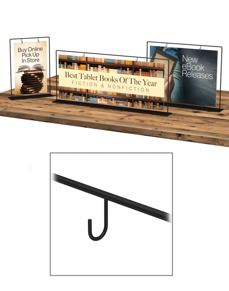 These countertop flip graphic holder are steel hook graphic holders, made to order in the USA. These are countertop steel graphic holder with steel J hooks, ideal for hole punched graphics. These countertop graphic stand are used widely as supermarket graphic countertops / supermarket countertop. These supermarket double hole graphic stand are lightweight and portable. These hole punch graphic holders can be made to your specifications in qty 25+. Standard, they're available as hole punch 2 hole graphic holders. These are ideal for highlighting supermarket specials or as menu stand double sided. These are metal menu stands that are countertop hang on graphic holder featuring wirehook j stand / wirehook j countertop, j hook steel countertop, wireform j hook stand, wireform j hook countertop.