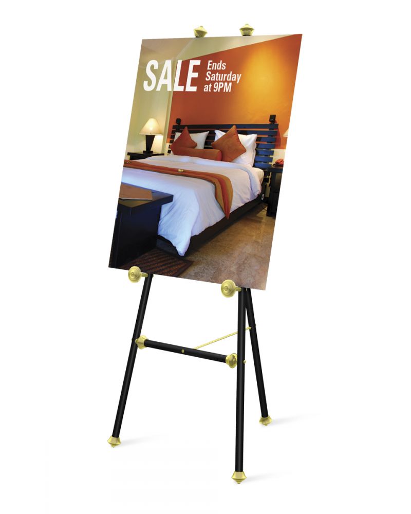 Our brass display easel is the industry leading option for hotels, businesses, entertainment events, conference centers, funeral homes, and more. These gold display easels feature beautifully finished tubing and gold look finials. They feature anodized screw machined aluminum posts before the finials. If you're looking for a gold easel, brass easel, baroque easel, baroque display easel, gold floor easel, brass floor easel, gold floor standing easel, fancy gold easel, fancy brass easel, brass floor standing easel, look no further! Still Made in the USA.