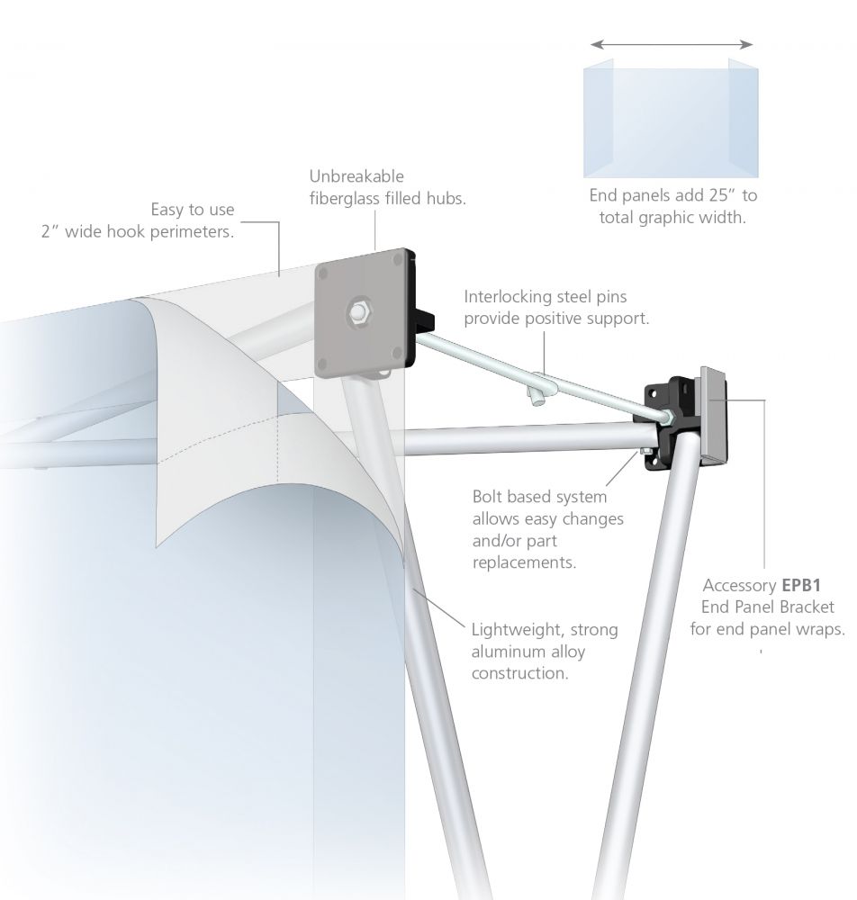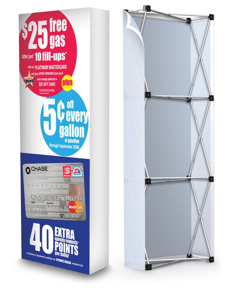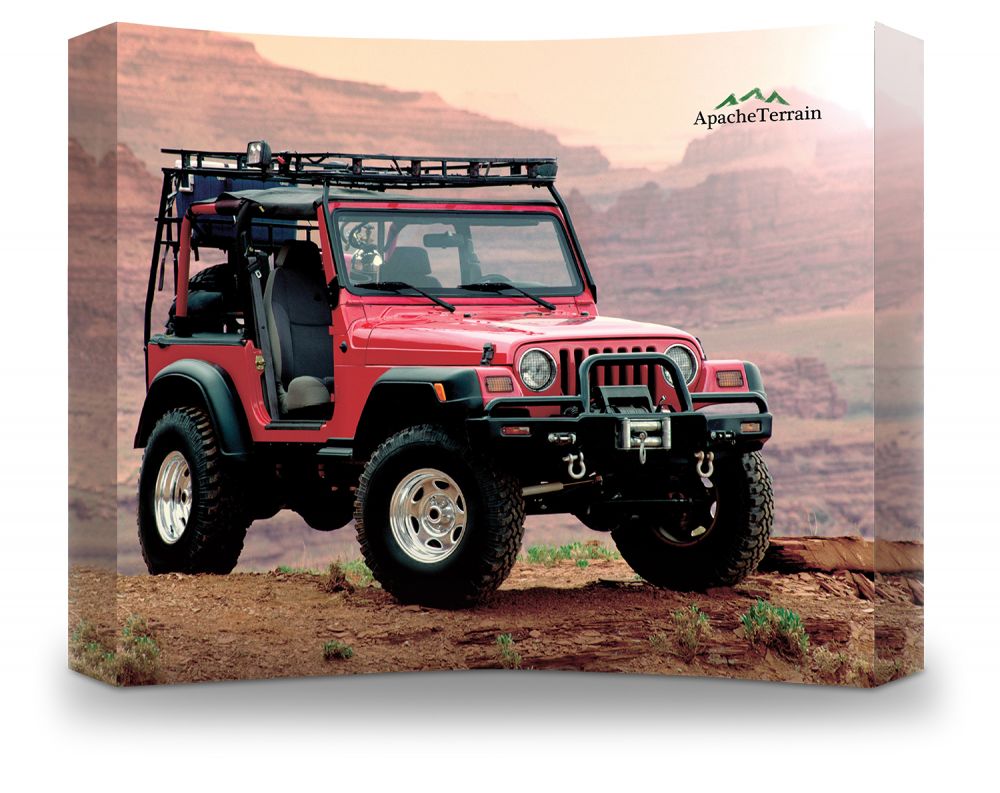 High impact 720 dpi Dye Sub Printing on a virtually “wrinkle free” stretch fabric, designed and engineered for this application. Custom printed from your art work.